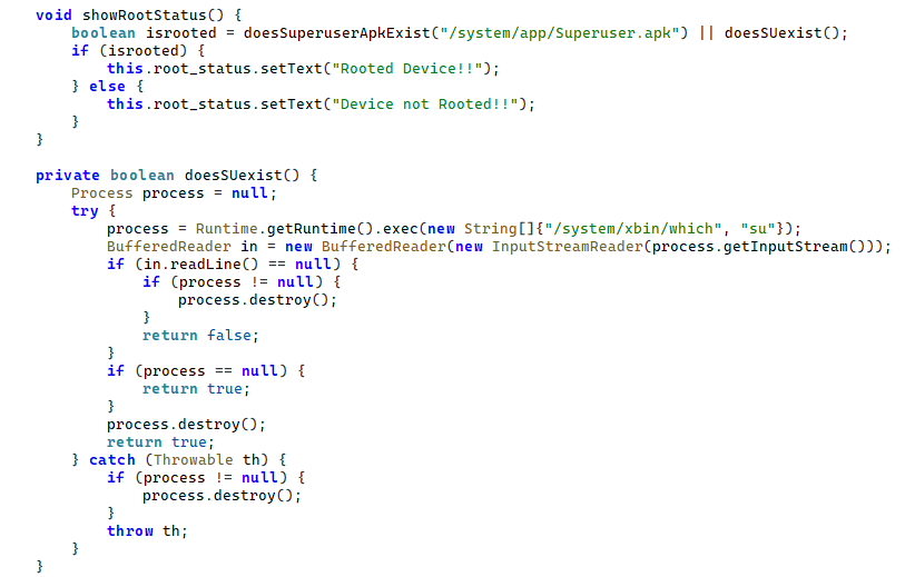 2. Runtime.getRuntime().exec()를 통해 "which su" 명령어를 실행하고, 실행 결과가 있으면 루팅 상태로 판단합니다.
